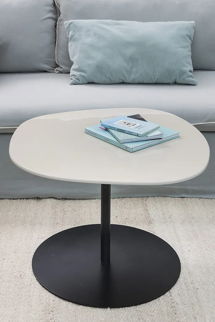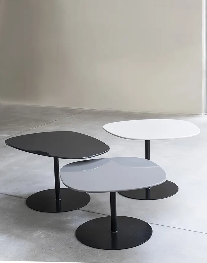 Mesas ratonas con base de hierro central y tapa de madera laqueada, con color a elección. Se fabrican en medidas estándar, la altura puede modificarse.