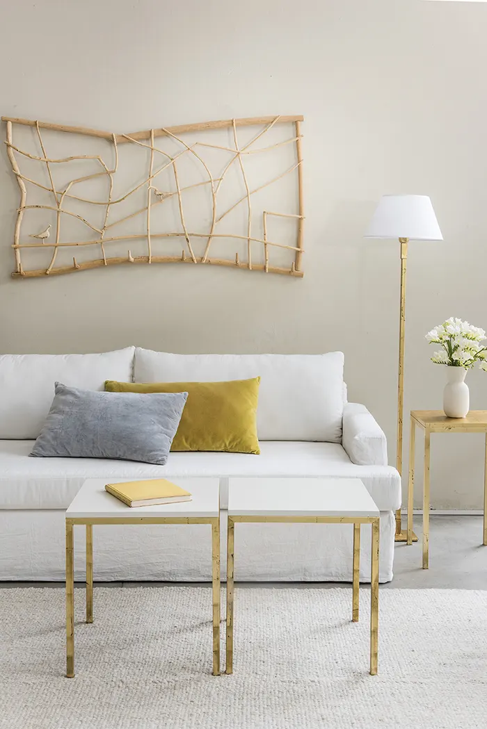 Grupo de mesas livianas ideales para mesas auxiliares. Patas de hierro, terminación dorada a la hoja. Tapa de madera laqueada semi mate, color tiza.